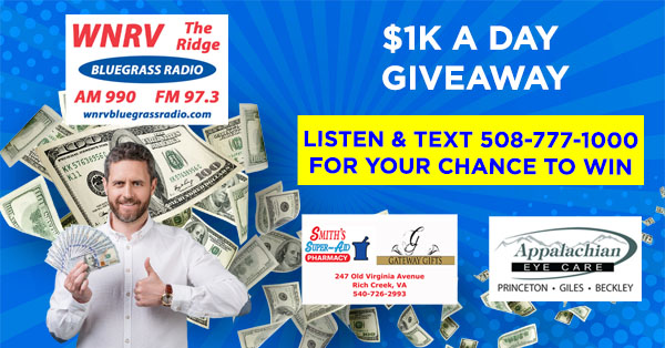 The WNRV $1K a Day Giveaway is brought to you by Appalachian Eye Care in Pearisburg and Smith’s Super-Aid Pharmacy in Rich Creek.